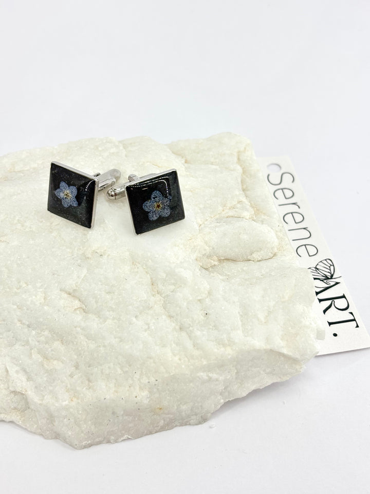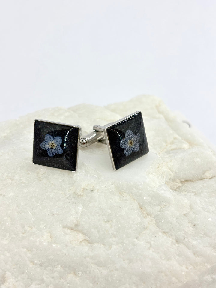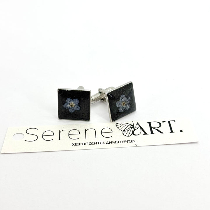 Χειροποίητα μανικετόκουμπα από ατσάλι με φυσικά στοιχεία σε υγρό γυαλί — κάθε κομμάτι και μια διακριτική ιστορία.